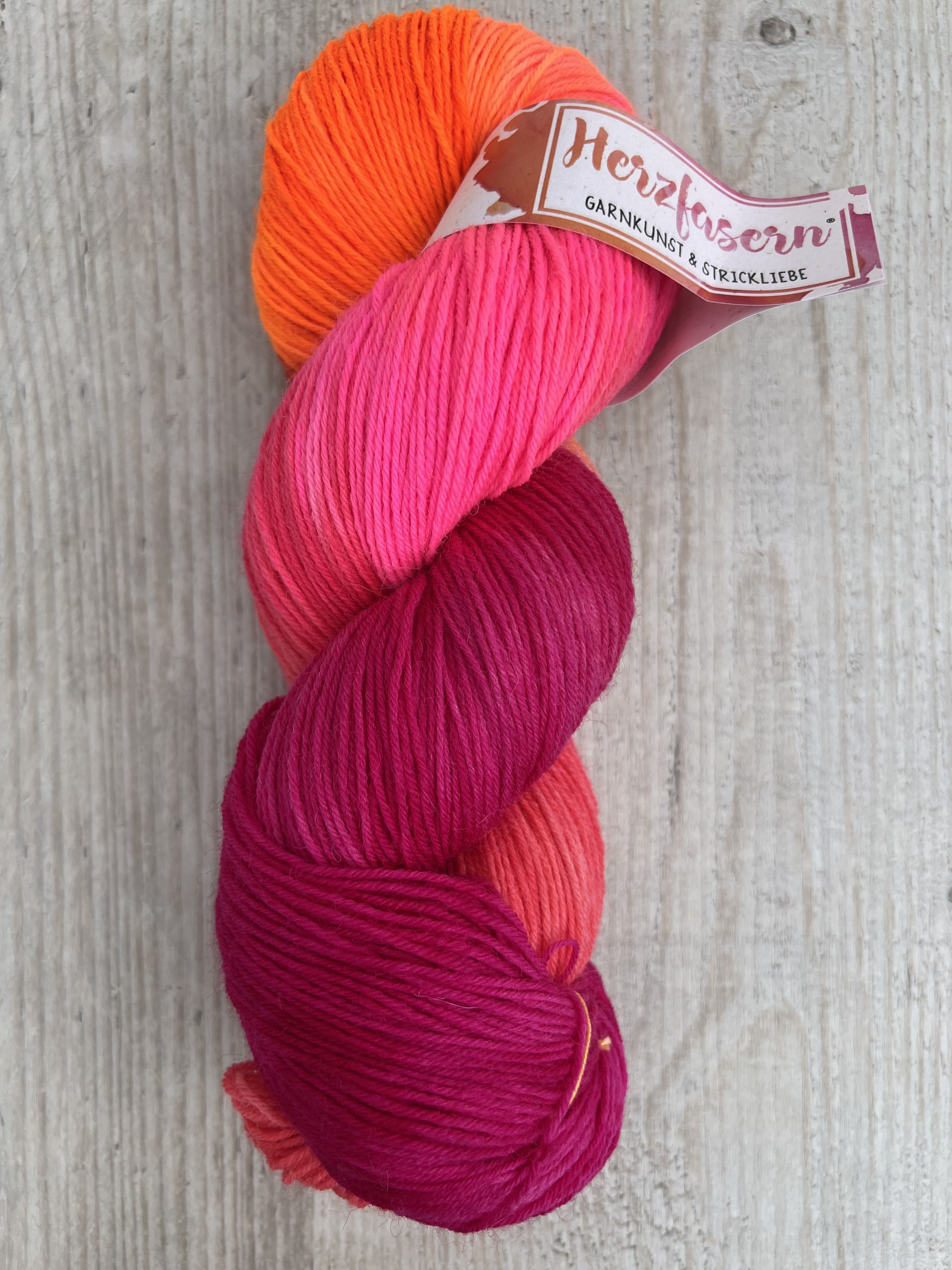 Lass dich von der sprühenden Lebensfreude und einzigartigen Farbintensität der „Petras Farben die Zweite“ begeistern! Diese besondere Färbung kombiniert lebendige Nuancen von strahlendem Orange, fröhlichem Pink und tiefem Magenta zu einem harmonischen Farbspiel, das jedes Strickprojekt zu einem absoluten Blickfang macht.