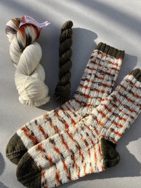 Unser Soktober-Special „Blättertanz“ tanzt in den Farben des Herbstes – ein cremiger Grundton mit lebendigen Sprenkeln in warmem Orange, sattem Braun und sanftem Grau. Der dazugehörige Oliv-Mini ergänzt das Set perfekt für Fersen, Spitzen oder Bündchen.