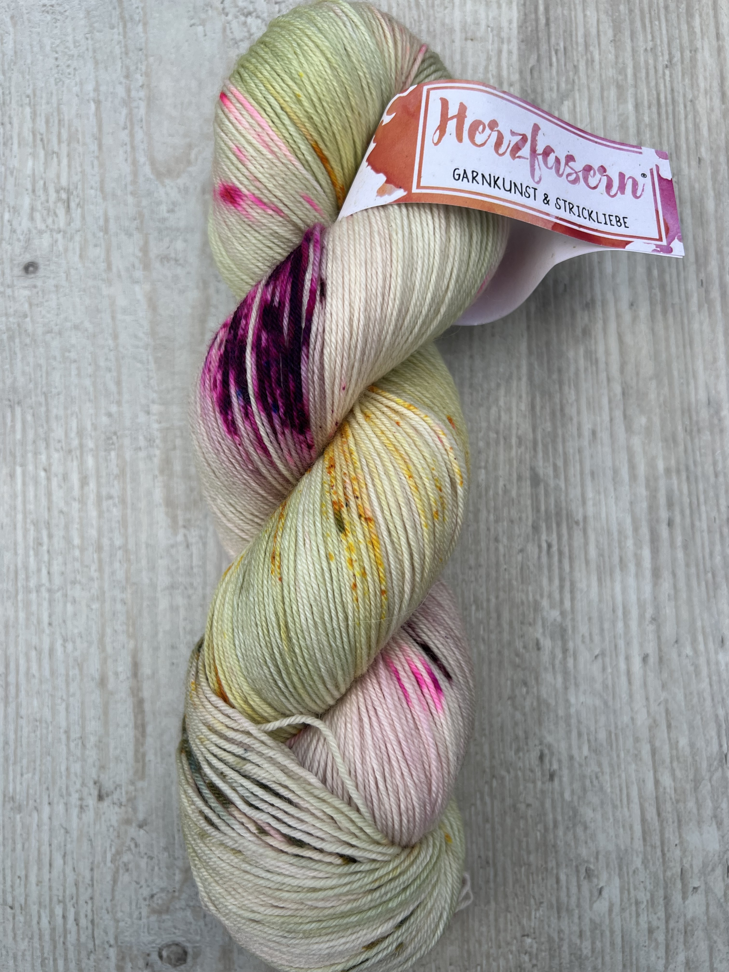 Gefärbt auf unserer Herzfasern No. 27 – Sockenwolle mit Kaschmir, vereint diese Qualität weichen Luxus mit Alltagstauglichkeit. Die Wolle ist formstabil, atmungsaktiv und gleichzeitig kuschelig weich – perfekt für Socken, Accessoires oder feine Oberteile.