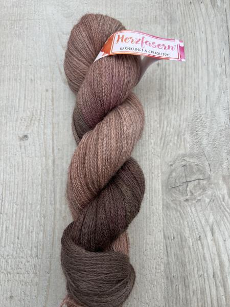 „Schoko-Samt“ vereint weiche Braunnuancen mit einem Hauch Rosé und einer ganz dezenten, natürlichen Tiefe. Dieser Farbton wirkt ruhig, elegant und harmonisch – wie feiner Kakaopuder auf warmem Stoff. Die besondere Fasermischung der Herzfaser No. 33 – 50 % Falklandwolle, 25 % Gotland, 25 % Corridale – erzeugt eine feine Melierung, die das Strickbild lebendig, aber nicht unruhig erscheinen lässt.