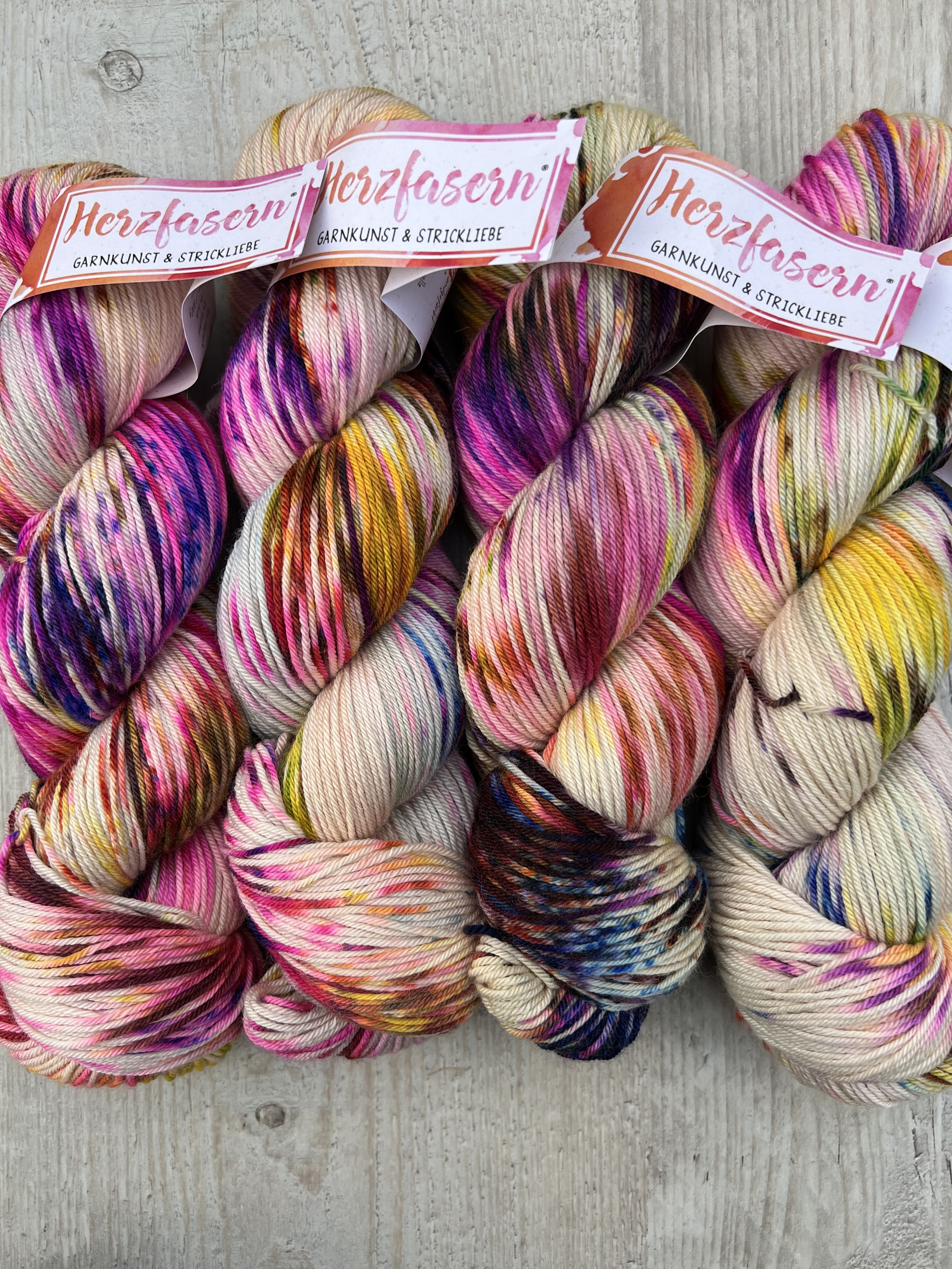 Ein wilder, fröhlicher Farbenrausch aus Pink, Gelb, Orange, Blau und feinen dunklen Sprenkeln – wie Konfetti auf Wolle. Jede Drehung zeigt neue Nuancen, jeder Strang erzählt seine eigene bunte Geschichte.
