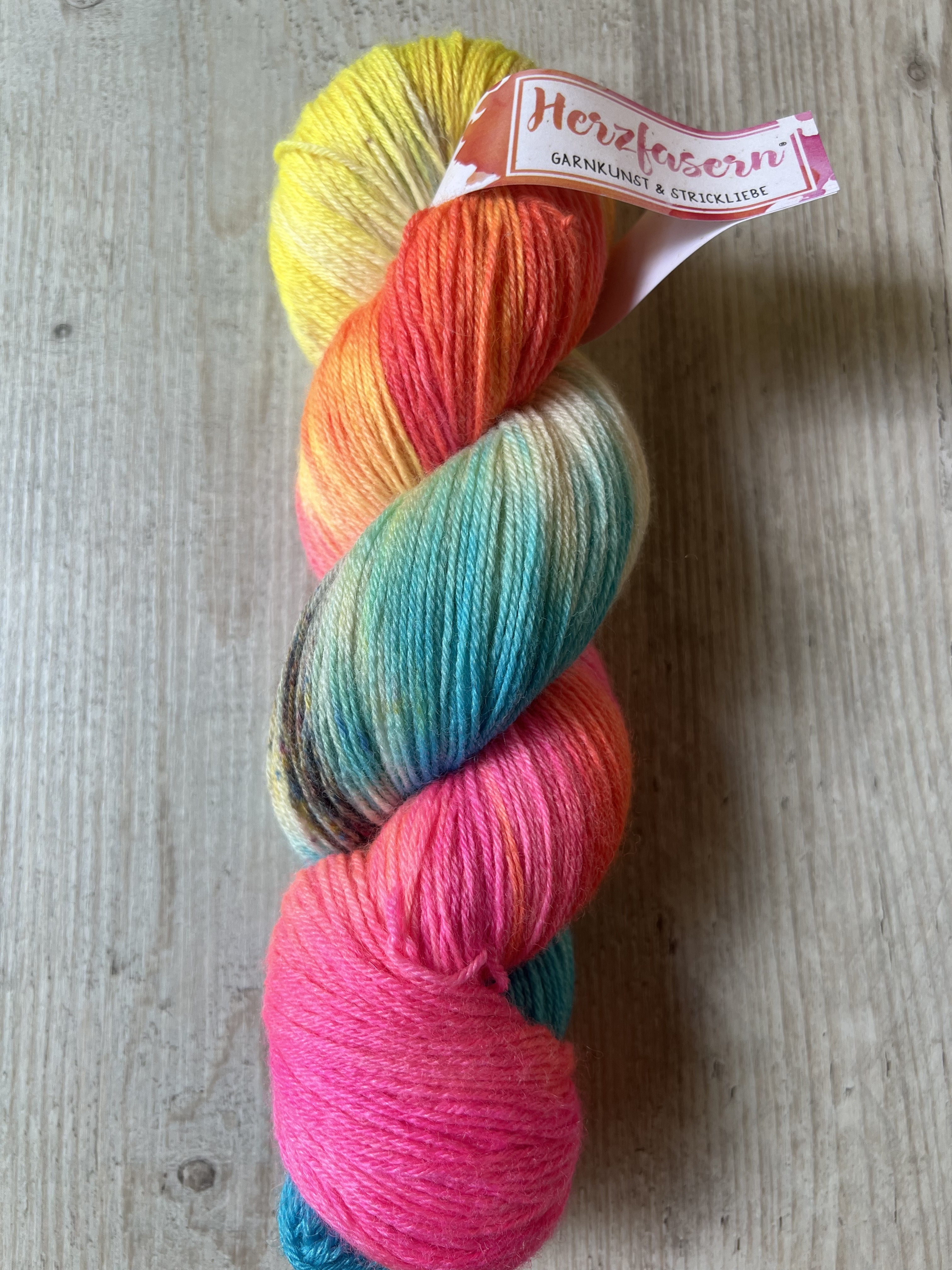 Leuchtendes Pink, sattes Gelb, knalliges Türkis, warme Orangetöne und freche Sprenkel tanzen auf dieser Basis wie Konfetti in der Abendsonne. Ideal für alle, die ein bisschen Glanz im Leben und in ihrem Strickprojekt vertragen können.