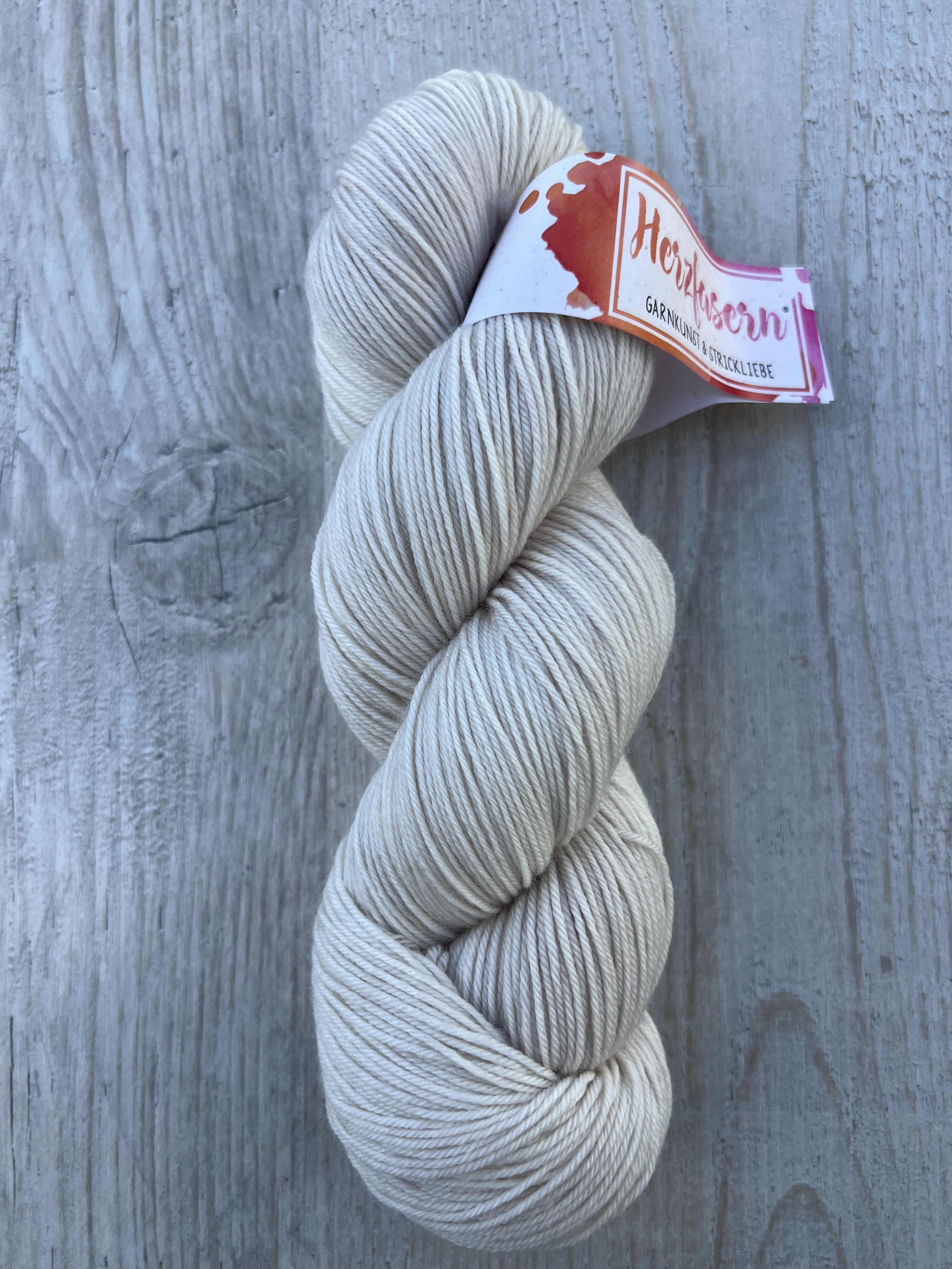 Herzfasern No. 11 – Perlmutt ist pure Eleganz in zartem Licht. Dieser sanfte, cremeweiße Farbton erinnert an den feinen Schimmer einer Perlmutt-Muschel und lässt sich mit allem kombinieren – perfekt für zeitlose, edle Projekte. Auf unserer beliebten Basis aus 100 % Schurwolle (Merino, superfine) strahlt die Farbe weich und gleichmäßig, ohne kühl zu wirken.