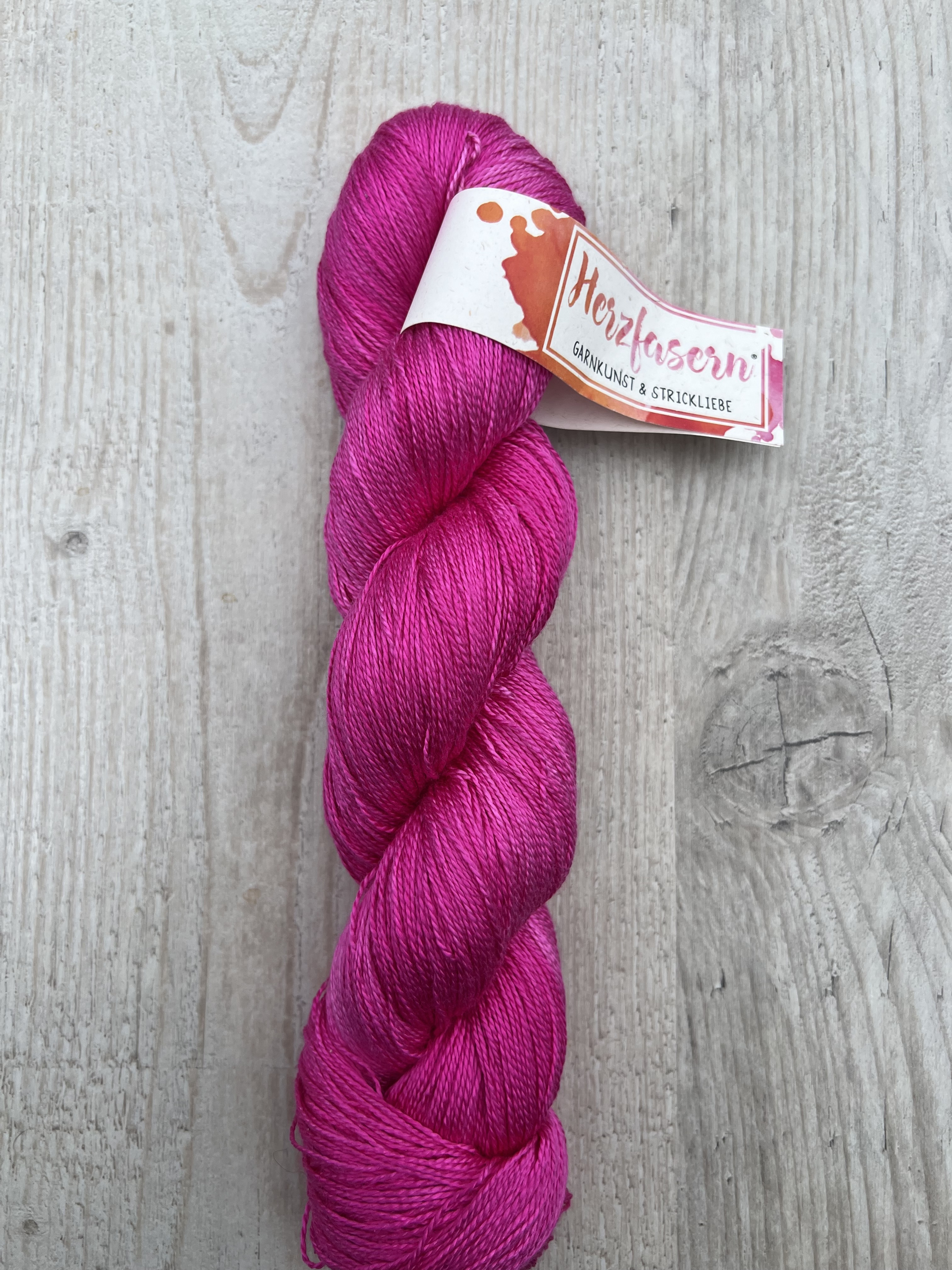 Dieser intensive Pinkton bringt nicht nur Projekte zum Strahlen, sondern auch Herzen zum Hüpfen. Auf reiner Seide gefärbt, bekommt die Farbe eine leuchtende Tiefe und edlen Glanz, ohne jemals kitschig zu wirken.