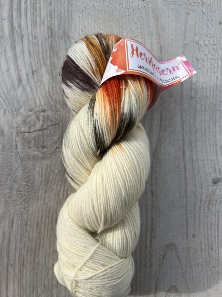 Blättertanz – eine exklusive Soktober-Färbung auf unserer robusten Herzfasern No. 20, Deutsche Sockenwolle. Inspiriert vom raschelnden Herbstlaub vereint dieser Strang warme Orangetöne, gedecktes Braun und cremige Naturtöne zu einem harmonischen Farbenspiel. Perfekt für gemütliche Sockenprojekte, die dich durch die bunte Jahreszeit begleiten.