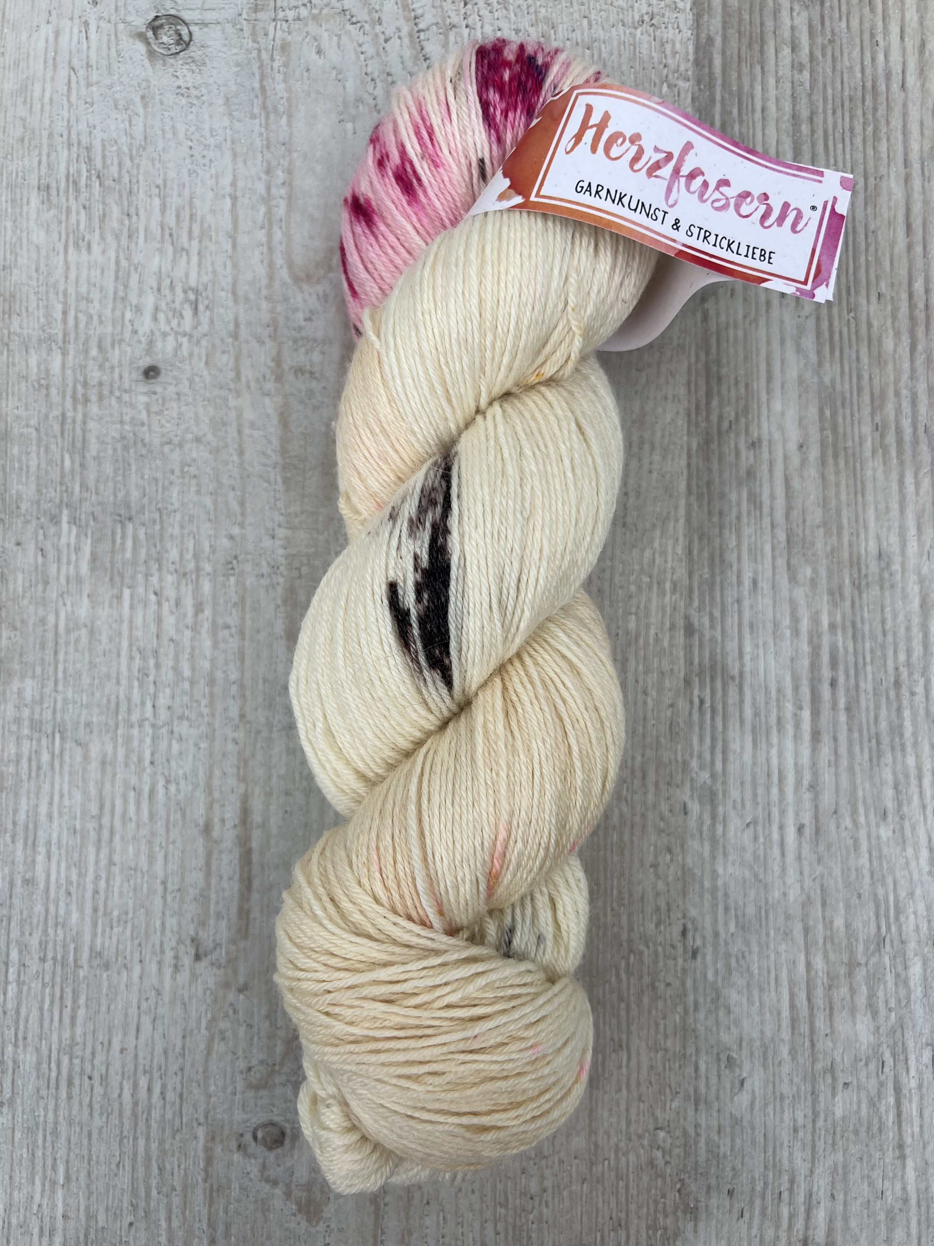 Gefärbt auf unserer Herzfasern No 28, bestehend aus 80 % Bluefaced Leicester und 20 % Bambusviskose, mit einer Lauflänge von 400 m auf 100 g.