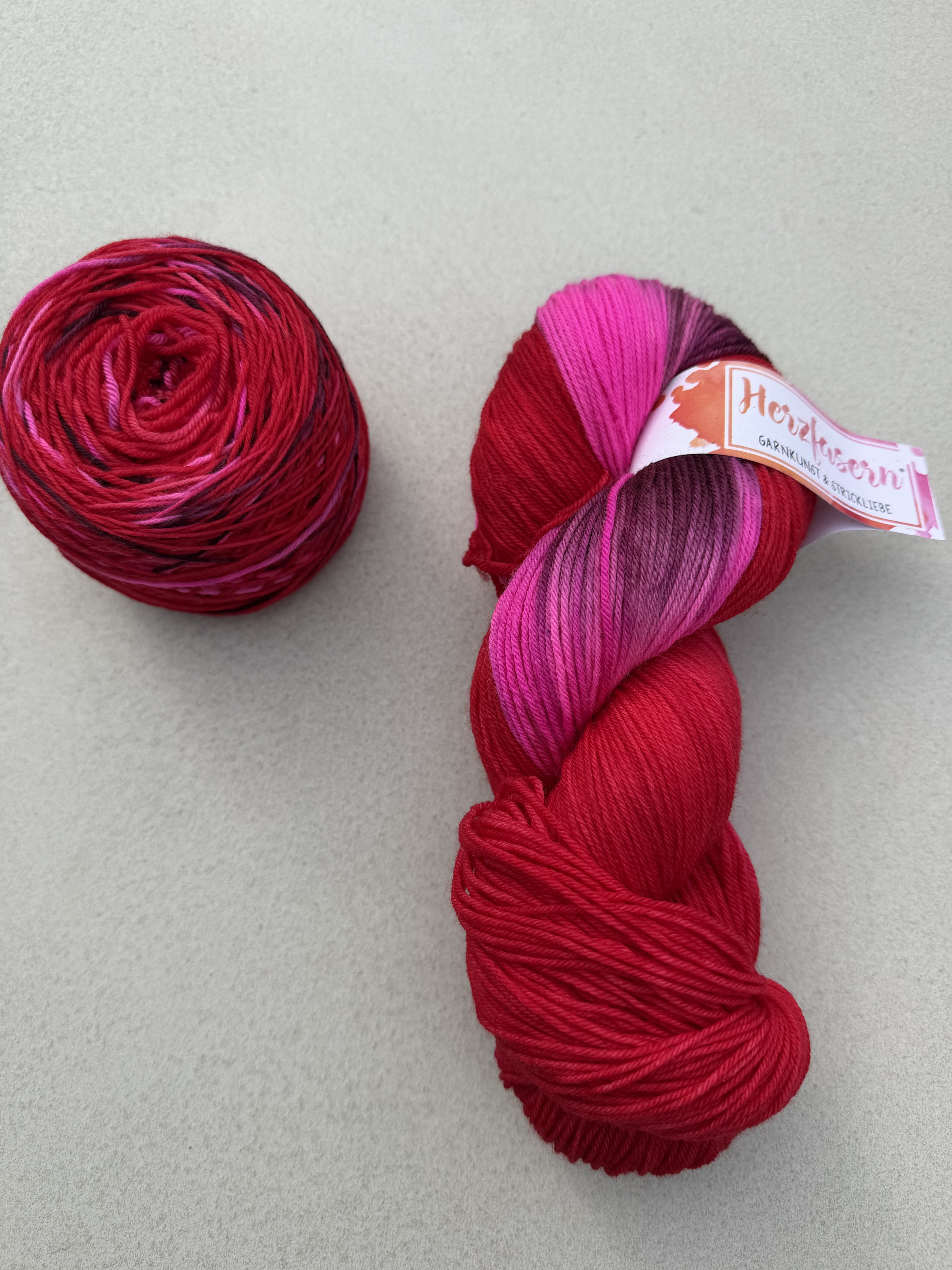 Ein klares, kräftiges Rot bildet die Basis, durchzogen von leuchtendem Pink und begleitet von dunkleren Nuancen, die dem Garn Tiefe und Struktur geben.