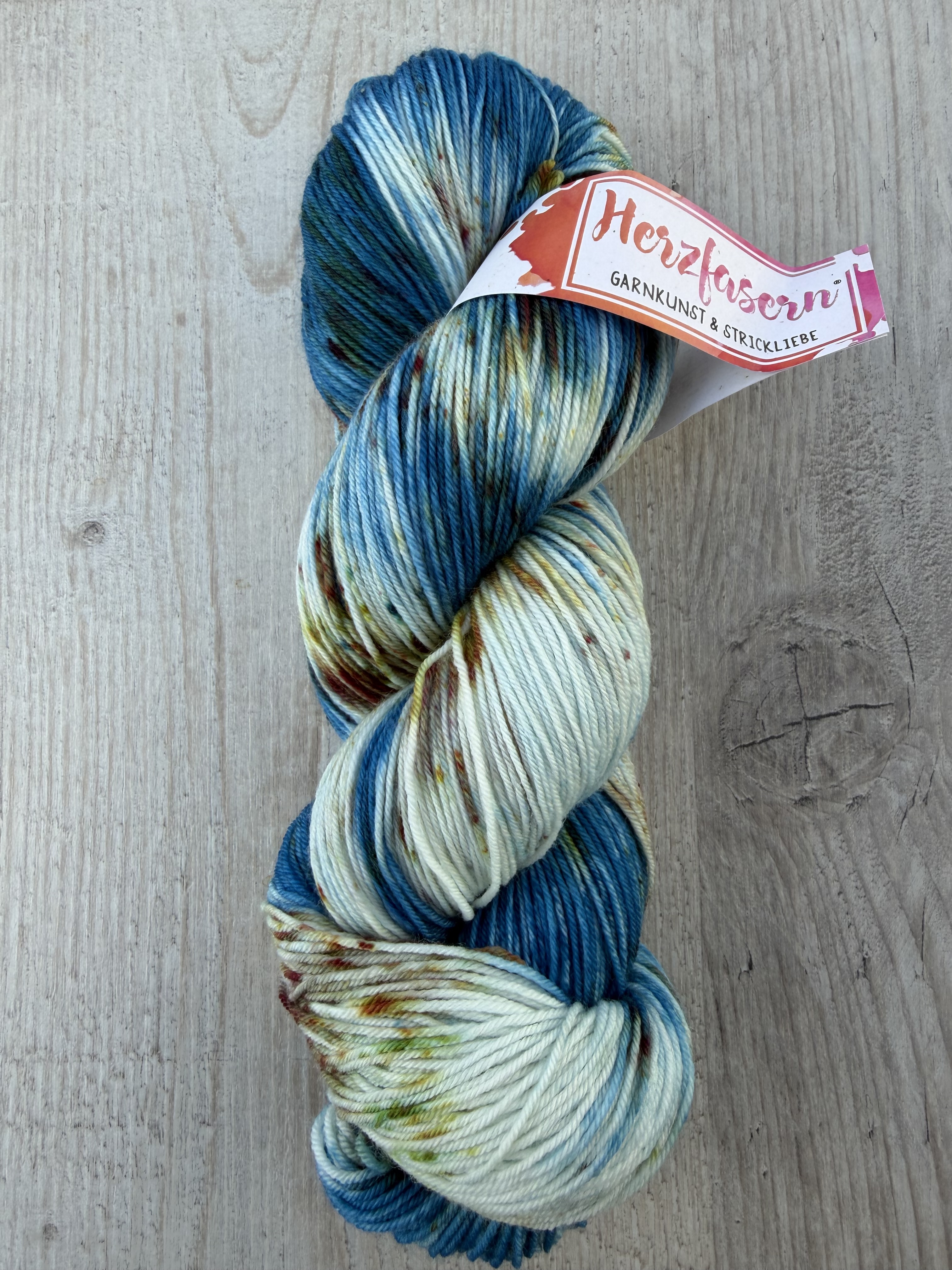 Gefärbt auf Herzfasern No. 27, einer besonders angenehmen Sockenwolle mit Kaschmiranteil, die sich weich anfühlt und gleichzeitig alltagstauglich bleibt.