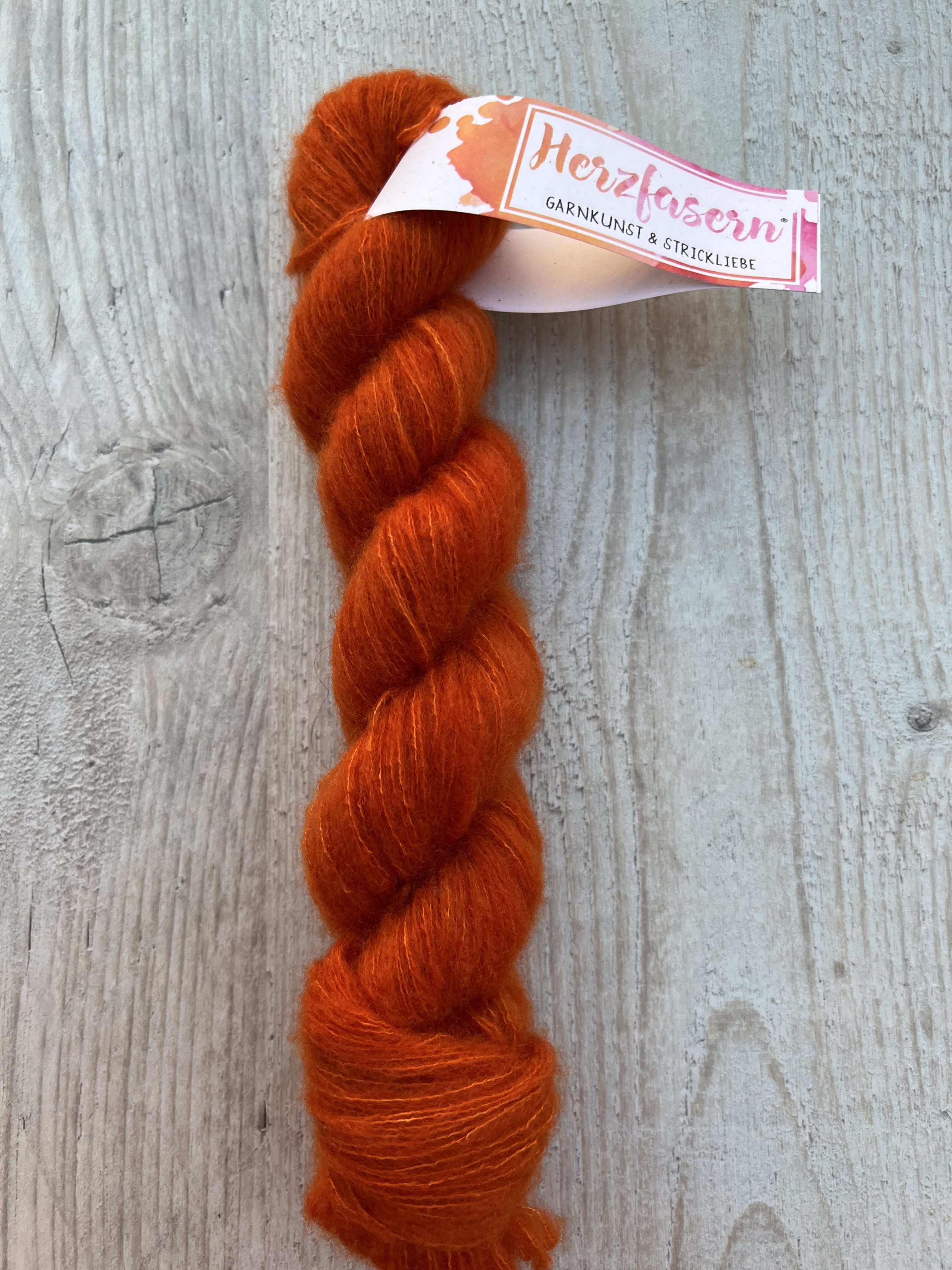 Kupferkuss – ein leuchtendes, warmes Orange, das wie ein Sonnenuntergang in den Fasern glüht. Auf federleichtem Cashmere-Seide-Garn wird jede Masche zu einem feurigen Liebesgruß an deine Nadeln.