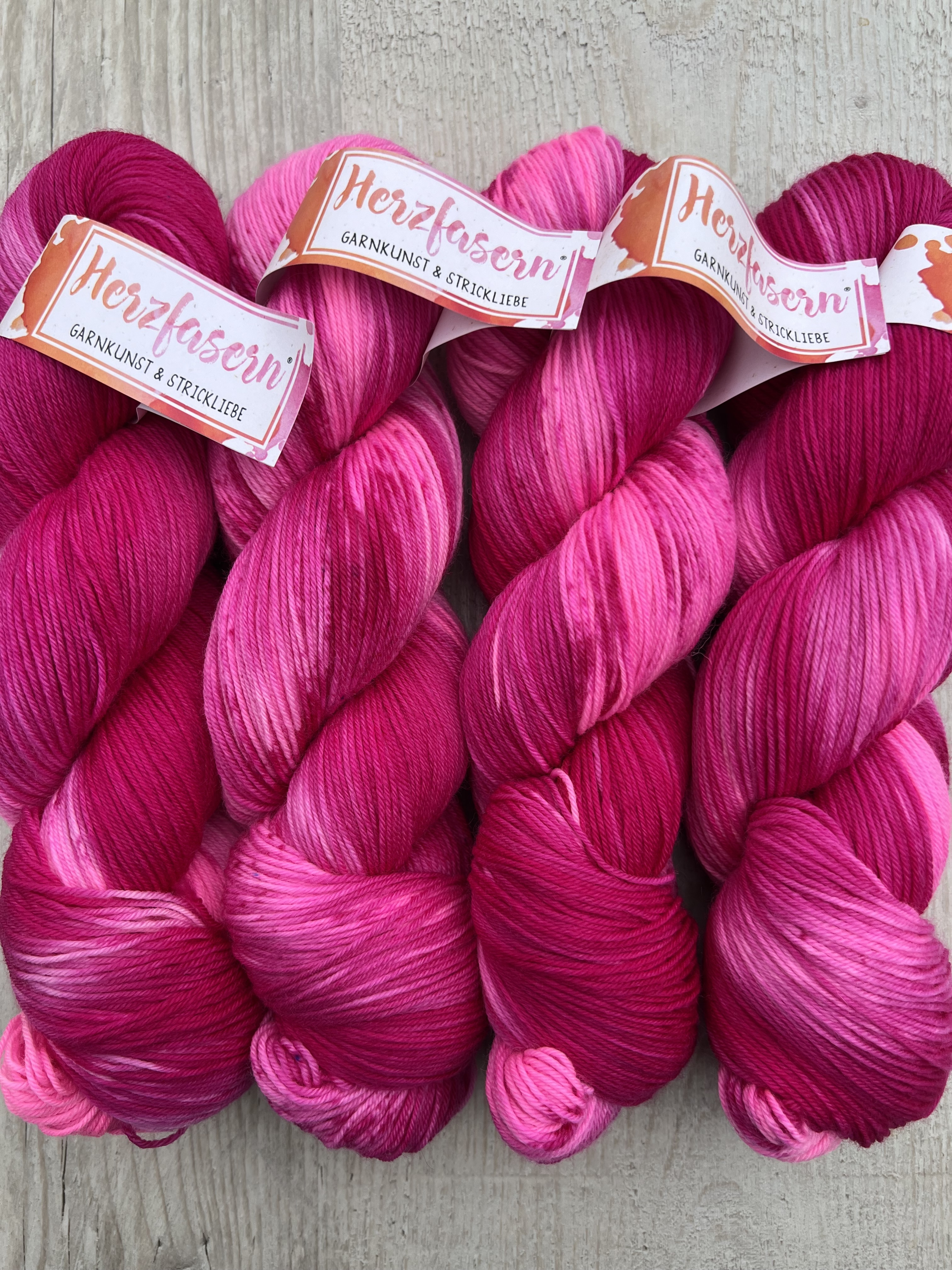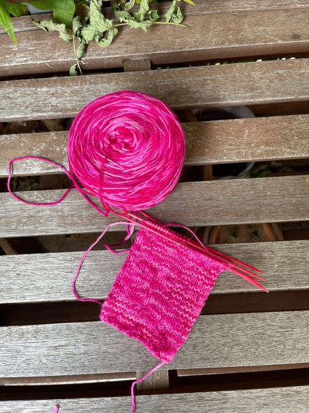 Nachfaerbung moeglich: Rosenwirbel ist keine einmalige Unikatsfaerbung, sondern kann bei Bedarf erneut gefaerbt werden. Jeder Strang bleibt dennoch ein handgefaerbtes Einzelstueck mit feinen Nuancen.