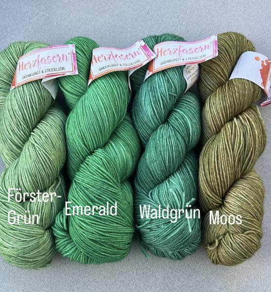 Es besteht aus vier Strängen Herzfasern No. 11 (100 % Schurwolle (Merino, superfine), mulesingfrei, Superwash) – handgefärbt mit ganz viel Herz und Strickliebe.
